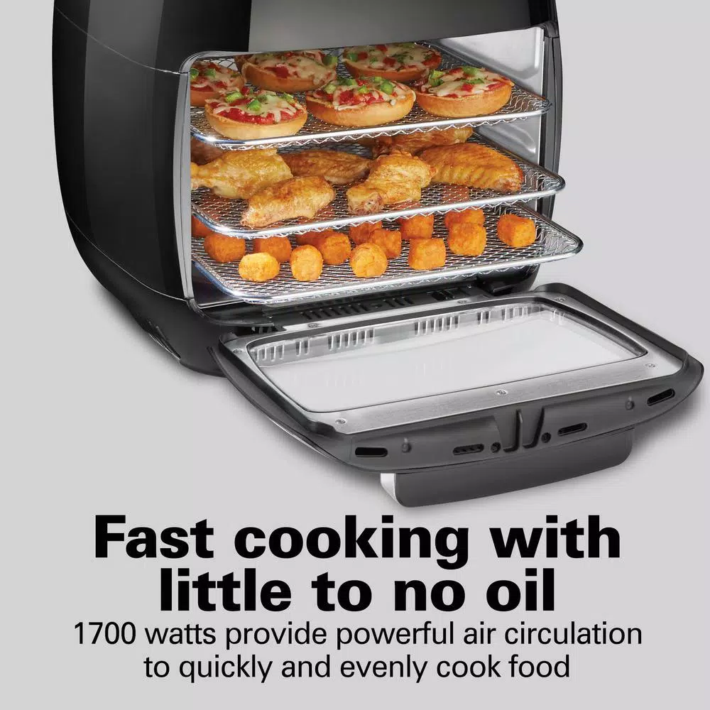 If you want to cook multiple ways but don’t want a cluttered kitchen countertop, you need an appliance that does it all. The Hamilton Beach 11 l Digital Air Fryer Oven with Rotisserie and Rotating Basket is perfect for families who want maximum cooking versatility and need room for preparing large meals. Once you have the Hamilton Beach 11 Liter Digital Air Fryer Oven in your kitchen, you’ll find yourself using it every day from breakfast to dinner. Since it cooks and reheats food faster than a traditional oven with powerfully circulated heated air, you’ll have dinner on the table faster than before and enjoy additional functionality that a simple oven can’t provide. Eight one-touch pre-set functions include fries, beef, chicken, fish, shrimp, rotisserie function, vegetables and dehydrate. It has a glass window and light for keeping an eye on food and you can customize your cooking by manually adjusting the time and temperature up to 60-minutes and 400°F. Accessories include 3 metal mesh shelves for toasting and dehydrating, a rotating metal basket for air frying, a multi-purpose shelf/crumb tray and a rotisserie basket.