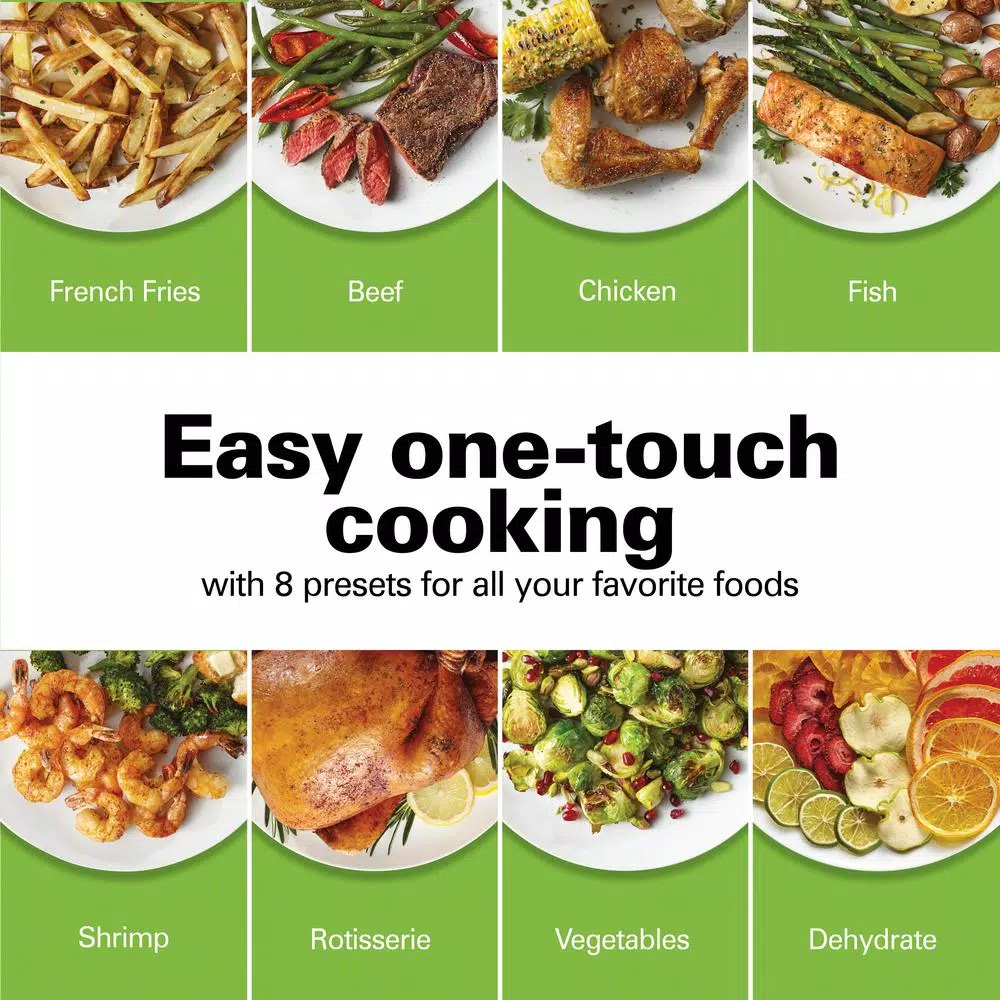 - 8 pre-sets include fries, beef, chicken, fish, shrimp, rotisserie function, vegetables and dehydrate