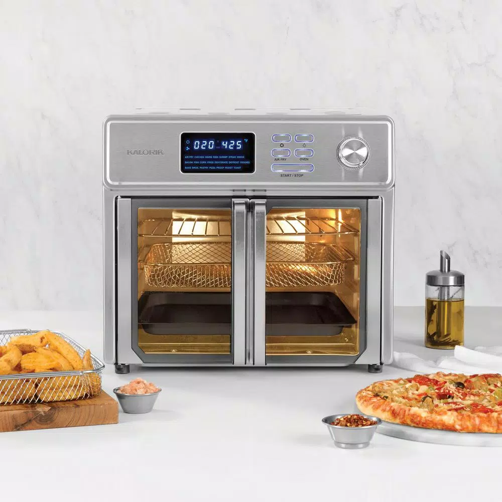 Discover the new generation of air fryer ovens. Kalorik 26 qt. Digital Maxx Air Fryer Oven combines 10-appliances into one. It functions as an air fryer, roaster, broiler, rotisserie, dehydrator, oven, toaster, pizza oven and slow cooker. Kalorik Digital Maxx Air Fryer Oven uses special Turbo Maxx technology to cook food faster than ever. Upper and lower heating elements provide even heat distribution for perfectly-cooked results. Optimized airflow system and high-performance turbo fan are engineered for maximum circulation, delivering the same crispy texture and rich flavor of deep fried food, with little to no oil. This reduces fat and calories for healthier meals. Unique rotisserie setting rotates the included spit accessory during cooking, allowing meat to roast evenly in its own juices and develop maximum flavor. Kalorik Digital Maxx Air Fryer Oven reaches up to 500°F, perfect for searing meat or vegetables to caramelized perfection. Oven can fit a large chicken, 12 in. pizza or up to 9-slices of toast in its cavity. Modern and multi-functional, Kalorik Digital Maxx Air Fryer Oven features glass French doors with single-hand opening to prevent dripping or scalding. Built-in auto-shutoff safety feature automatically stops operation when doors are open. Easy to use digital LED display contains 21-presets for foolproof cooking. Accessories: air frying basket, baking pan, air rack, crumb tray, bacon tray, steak tray, rotisserie spit, rack handle and rotisserie handle.