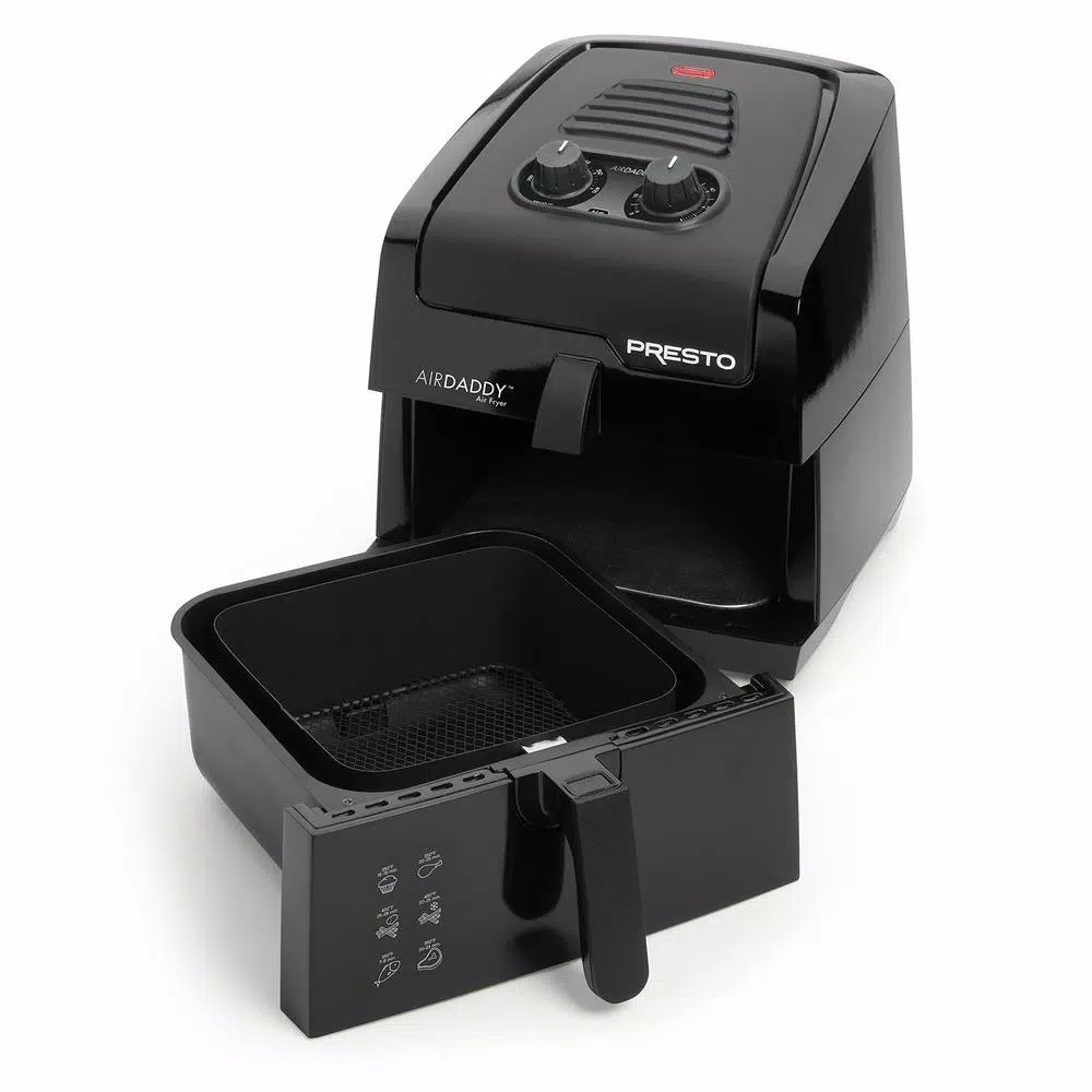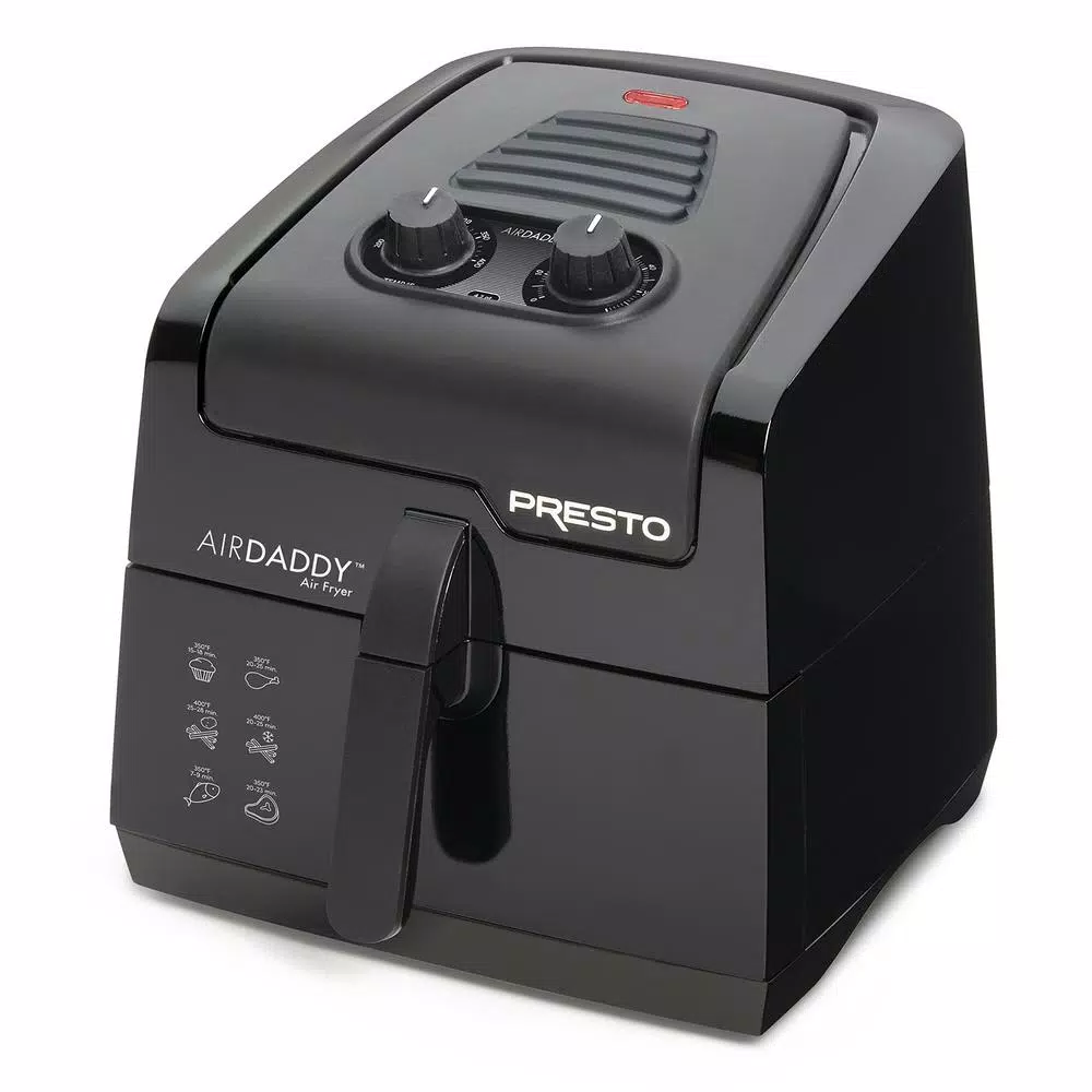 The AirDaddy electric air fryer cooks with little or no oil for delicious fried food without the added fat. Make french fries with up to 75% less fat. Plus, it roasts, grills, and even bakes cakes and muffins. The large 4.2 Qt. basket is ideal for family-size batches and removes for easy serving. Use the air fryer for french fries, appetizers, meats, poultry, seafood, and vegetables. Its great for fresh or frozen foods. The convection cooking system circulates hot air in every direction for foods that are crispy outside and tender inside. Features an adjustable thermostat and built-in 60-minute timer with automatic shut-off. Handy menu guide provides quick reference to cooking times and temperatures for many popular foods. Signal light indicates when the fryer is cooking. Pan and basket are fully immersible for cleaning. Built-in cord wrap provides convenient storage.
