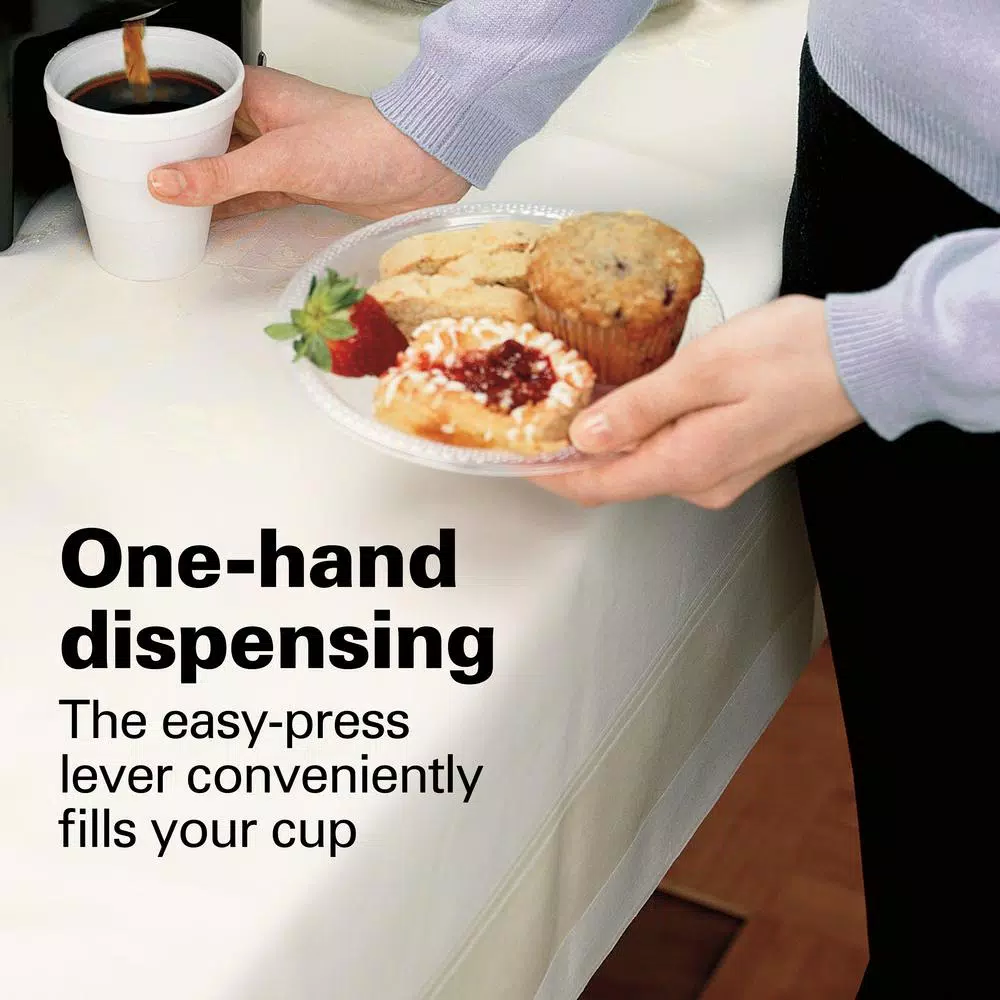 - Easy-press lever dispenses coffee into any kind of cup, including disposable cups