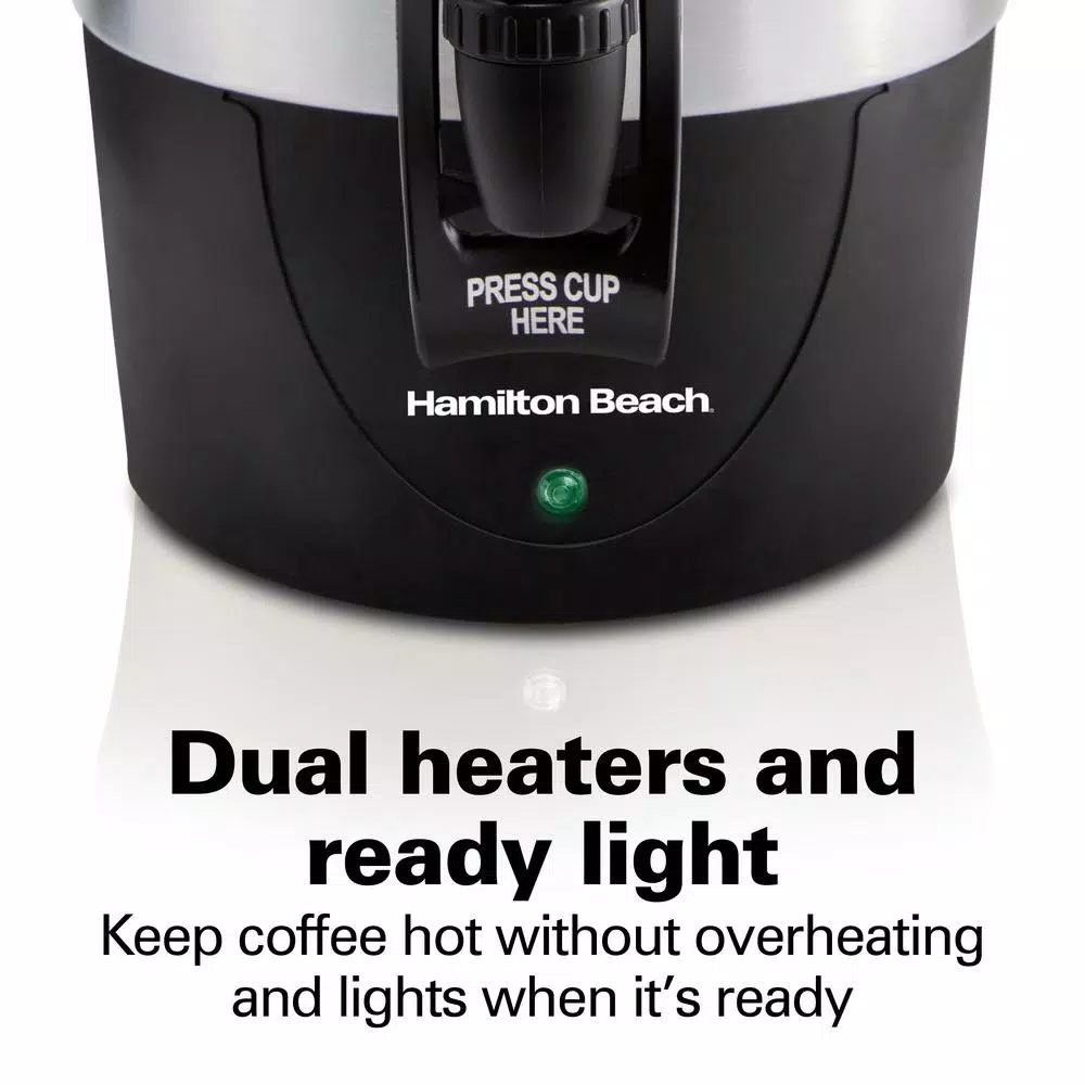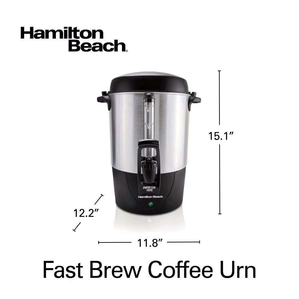 The Hamilton Beach Fast Brew Coffee Urn brews coffee 30% faster, reducing wait-time for your guests. The urn makes 15-45 cups of coffee, and brews 45-cups in just 28-minutes. The urn features dual heaters to keep coffee hot without overheating. The ready light illuminates to let you know when the coffee’s ready to serve. The urn is also great to use for hot tea and other drinks. Coffee is easy to pour from the urn using the easy-press lever, which is activated at the push of a cup making it easy to pour coffee using just one hand. The urn easily dispenses coffee into any kind of cup, even disposable cups. Clear water level markings in the urn’s water/coffee level window make it easy to see how much water you’re adding or how much coffee is left in the urn. The removable coffee filter basket lifts from the urn and is easy to clean in the dishwasher. No paper filters are needed. The brushed finish looks great with every decor and resists fingerprints. The handles stay cool to the touch for comfort, and the lid on the large coffee maker locks in place to eliminate spills.