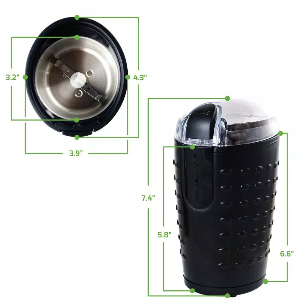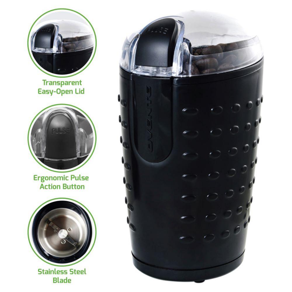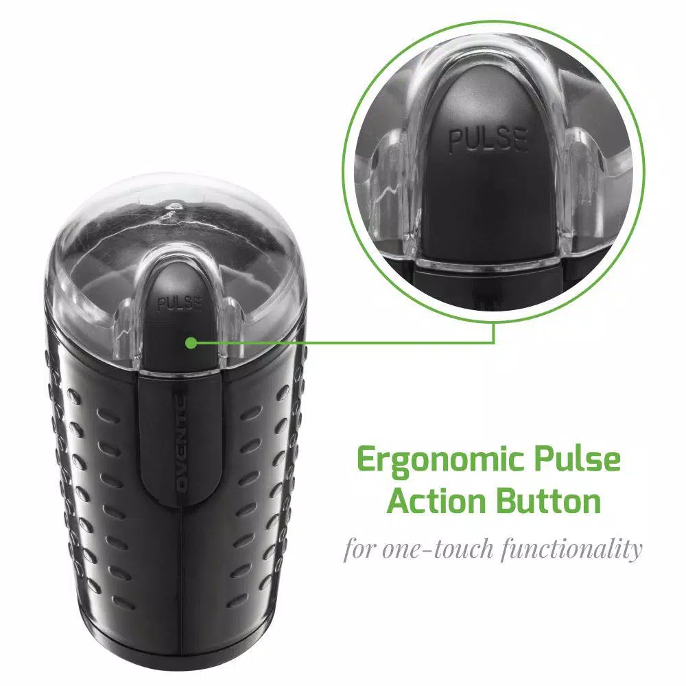 The Ovente Electric Grinder reinvigorates luscious flavors and aroma from ground coffee, tea leaves, herbs, spices, nuts, grains and so much more. Equipped with 150-Watt motor power, the Ovente Electric Grinder can pulverize and grind whole coffee beans into a freshly-ground powder within seconds. The high-quality stainless steel blades pave way for a better and smoother grind. Its stainless steel grinding bowl (hopper) holds up to 2.5oz (70g) of aromatic and flavorful ground products. The ergonomic oval structure of the body was carefully designed for easy gripping, making accidental slips a thing of the past. * Key Features: • 120V, 150-Watt low-noise motor for fast and powerful grinding while preserving the complex, aromatic flavors of your grind. • Ergonomic pulse action button for one-touch functionality • Discreet cord storage • Transparent EasyOpen lid gives you complete control over your grind • 2.5oz (70 grams) Stainless steel capacity • Comfortable oval-shaped body with ridges for easy grip • Stainless steel blades pulverize with precision from whole to coarse/fine grounds • Perfect for coffee beans, tea leaves, herbs, spices, nuts, grains, and more.