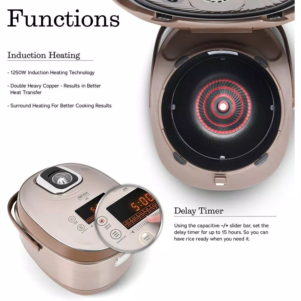 Cooking Great meals shouldn’t be a chore. With aroma professional Turbo convection/induction heating 20-cup rice cooker and multicore being the household chef couldn’t be easier. Induction heating (IH) technology offers Direct heating to the entire inner pot along With dual sensors for time and temperature accuracy to create precise and evenly cooked foods. Don’t be fooled that this appliance is only a rice cooker as it also functions as a multicore and it is just the beginning to creating other flavorful dishes with the added features of saute-then-simmer (sets), low and high slow cook, porridge, grains, soup and even cake. For a healthier alternative, The provided steam tray allows for healthy steaming of meats and vegetables, even as rice cooks below. Need rice in a pinch? The quick rice feature is great for a time saving option. Or plan ahead with the 15-hour delay timer is perfect for families on the go, delivering delicious rice ready when it’s needed. And when the cooking is done, the inner cooking pot and all accessories remove for easy cleanup in the dishwasher.