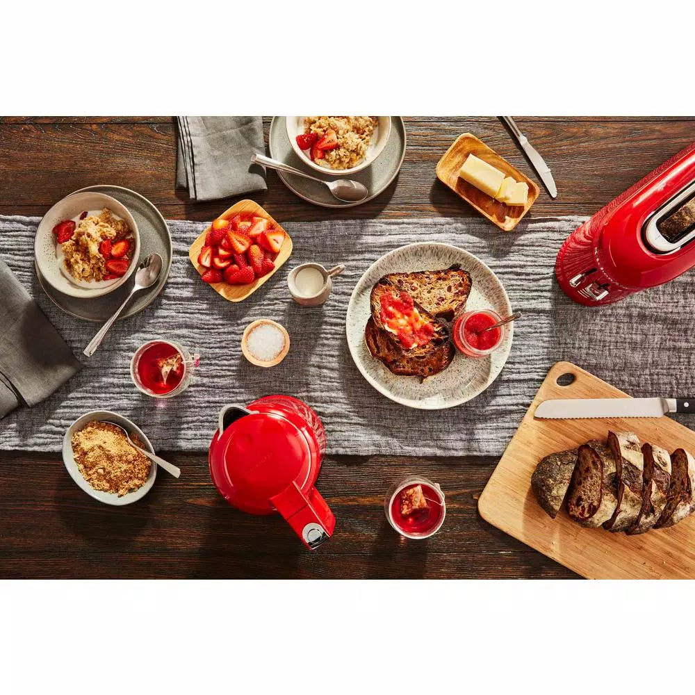 Add iconic style to your kitchen with this unique, limited-edition KitchenAid Kettle, featuring a modern, passion-inspired color, unique 100 year celebratory features, and 1.5L capacity, to boil multiple servings of tea, coffee, cereals and more. The dual wall insulation keeps the inside hot and exterior temperature lower*, helping you to easily move your kettle from the countertop to table top. This kettle also features an all-metal stainless steel interior to maintain water quality and easy to pour, push-button lid that opens with a single touch. *Compared to single wall kettle, model KEK1722.
