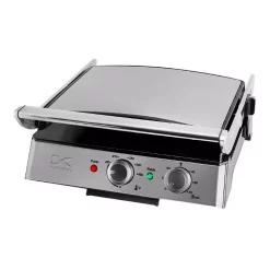 Grill all of your favorite meals easily while staying healthy with the Eat Smart Grill. The removable cooking plates are reversible, featuring a grill on one side and a griddle on the other for maximum versatility. Its floating hinge system automatically adjusts to any size of toast, meat or snack while the hovering function allows the upper plate to be set at different heights to avoid direct contact with food. The adjustable temperature control knob and timer function let you cook your meals to perfection. Non-stick coating on the plates makes grilling and cleaning easy while excess oil and fat is drained into the drip tray. Open the unit to 180 to reveal a 200 Sq. in. cooking surface, perfect to prepare meals for the whole family. The unit also features a cool-touch handle and cord-wrap storage for added security and convenience. Enjoy healthy and easy grilling today.