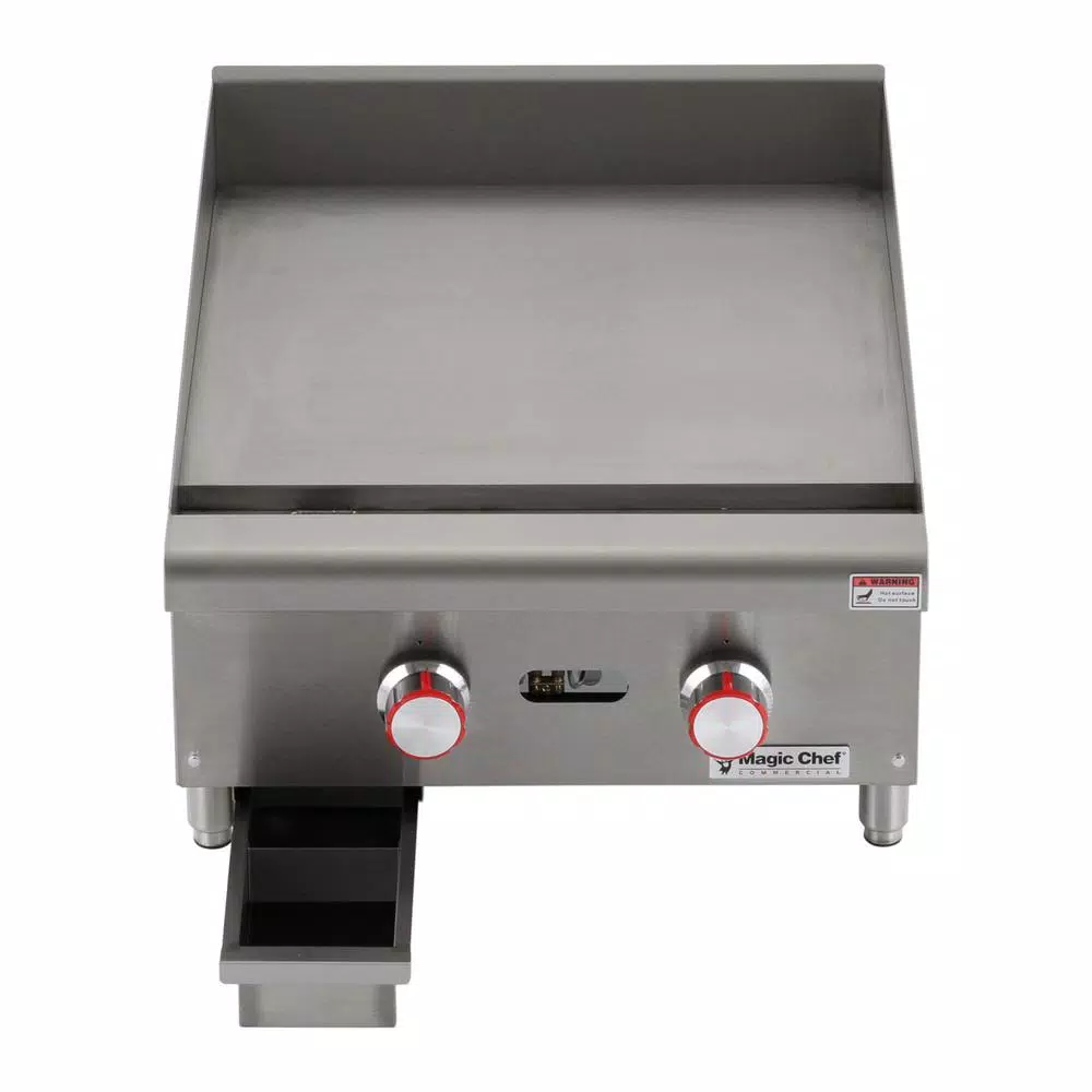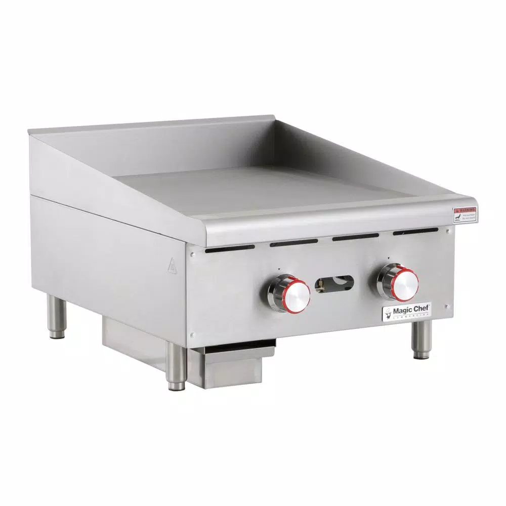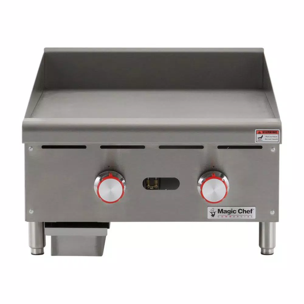 The Magic Chef Commercial 24 in. wide thermostatic countertop griddle is an efficient and durable addition to a commercial kitchen. The cooking surface is 24 in. deep; with the cooking surface in total an ample 571.2 sq. in. The burners are u-shaped and are placed every 12 in. for efficient heating. The temperature probe is embedded for more accurate cooking performance. Back and side splashes are stainless steel and are designed to help keep your work environment cleaner. Includes a drip tray for easy cleaning Adjustable legs allow you to customize the height according to your food prep needs.