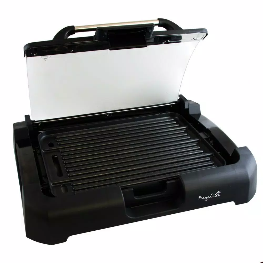 The Megachef Reversible Indoor Grill and Griddle with Removable Glass Lid is designed with a non-stick coating so that you can easily prepare delicious and appetizing meals with less oil than traditional cooking methods. MegaChef understands that no matter the weather outside, friends and family should always be welcome to enjoy juicy grilled meats and vegetables. Rain or Shine, this grill will be your ticket to those perfect grill lines everyone loves to see. The versatility of a reversible cooking surface means you can grill your meats and veggies, flip the grills cooking surface over and use it as a griddle for eggs, pancakes and much, much more.