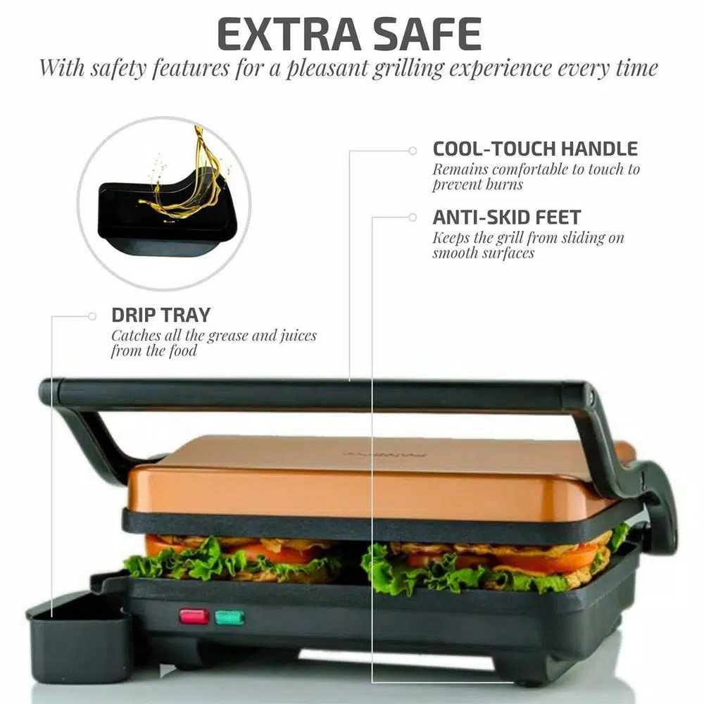 Turn ordinary dishes and bread into mouthwatering ones this electric grill will transform you into a culinary hero real quick. With this, you’ll discover those grilling appetizing dishes is not as hard as it sounds. You can make smoking hot Panini for breakfast and delectable finishes and steaks for dinnerware with minimal effort. equipped with safety features apart from the cool-touch handle and anti-skid feet so you would be sure that you would keep accidents at bay. evenly cooks food, say goodbye to unevenly cooked meat. Our non-stick coated plates cook meat thoroughly so that each forkful of steak is savory to the last bite. since it is slim and compact enough that it takes little space from your kitchen countertops, you can carry it to your trips whenever you want to. The Red light indicates that the grill is preheating, and the green light tells you that the press is ready for cooking. These idiot-proof settings make this perfect for everyday use. keeps your food healthy with this Panini grill, appetizing dishes would always be guilt-free. You don’t have to use cooking oil, and more So, it drains the extra fat right to the drip tray while keeping the tenderness and rich flavors of the food. hassle-free cleaning since the grill has a drip tray that catches all the grease and juices from the food, cleaning It requires little to no effort. Just wipe the plates with a sponge or cloth dampened in soapy water and let them dry.