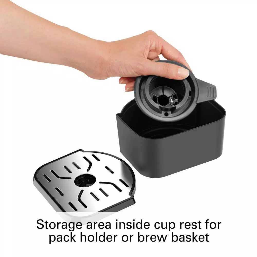 - Storage area inside cup rest for single-serve pack holder or brew basket