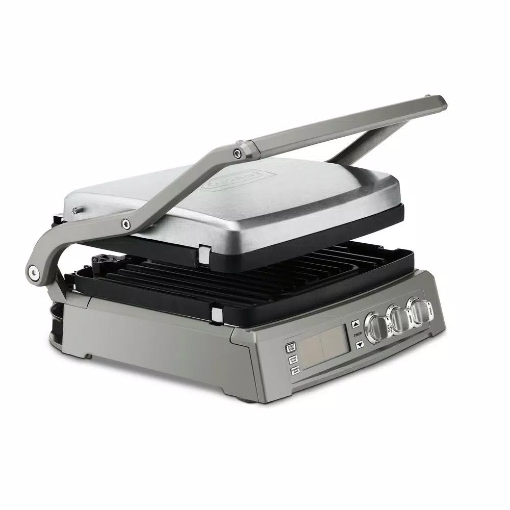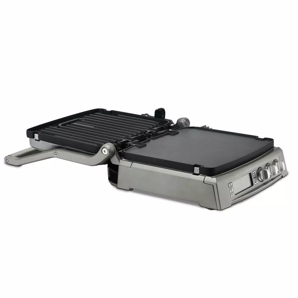 - 6-cooking options in 1: contact grill, panini press, full griddle, full grill, half grill/half griddle, top melt