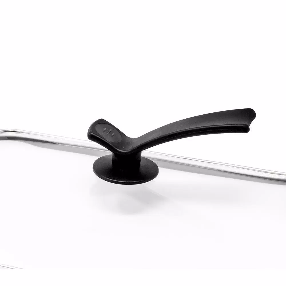 - Tempered glass lid with handle, specially designed to stand on the counter top and prevent risk of scalding