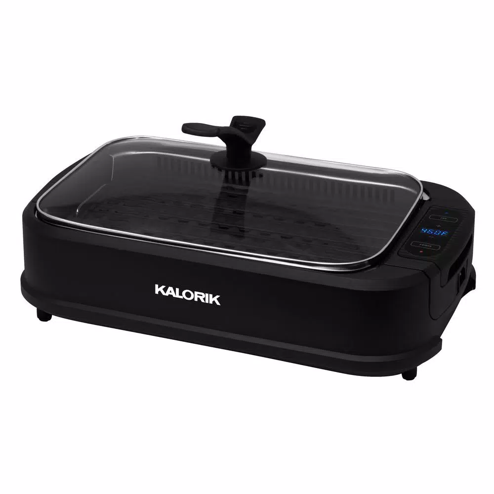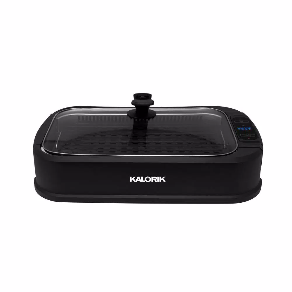 The Kalorik Electric Indoor Smokeless Grill is ideal for grilled meals without any mess and smoke. Its innovative built-in smoke-extracting fan is perfect for indoor cooking, and the grill quickly heats up to the optimal cooking and searing temperature of 460 degrees. It features an easy to clean and dishwasher-safe removable grill plate. The Kalorik Electric Indoor Smokeless Grill boasts a bright LED display and a removable drip tray for healthier grilling. Enjoy grilled foods year-round, easily and smoke-free! For recipes, visit Kalorik.com.