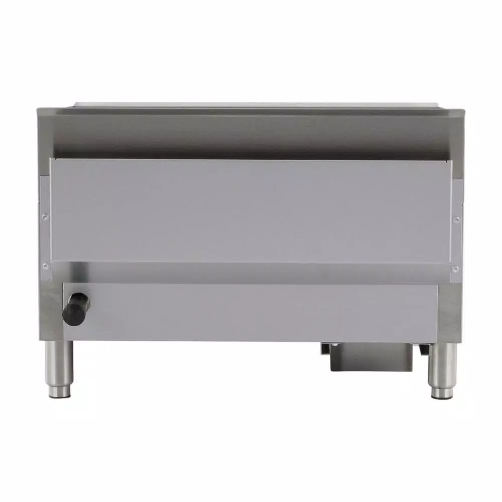 The Magic Chef Commercial 24 in. wide countertop griddle is an efficient and durable addition to a commercial kitchen. The cooking surface is 24 in. deep; with the cooking surface in total an ample 571.2 square inch The burners are u-shaped and are placed every 12 in. for efficient heating and cooking performance. Back and side splashes are stainless steel and are designed to help keep your work environment cleaner. Includes a drip tray for easy cleaning Adjustable legs allow you to customize the height according to your food prep needs.