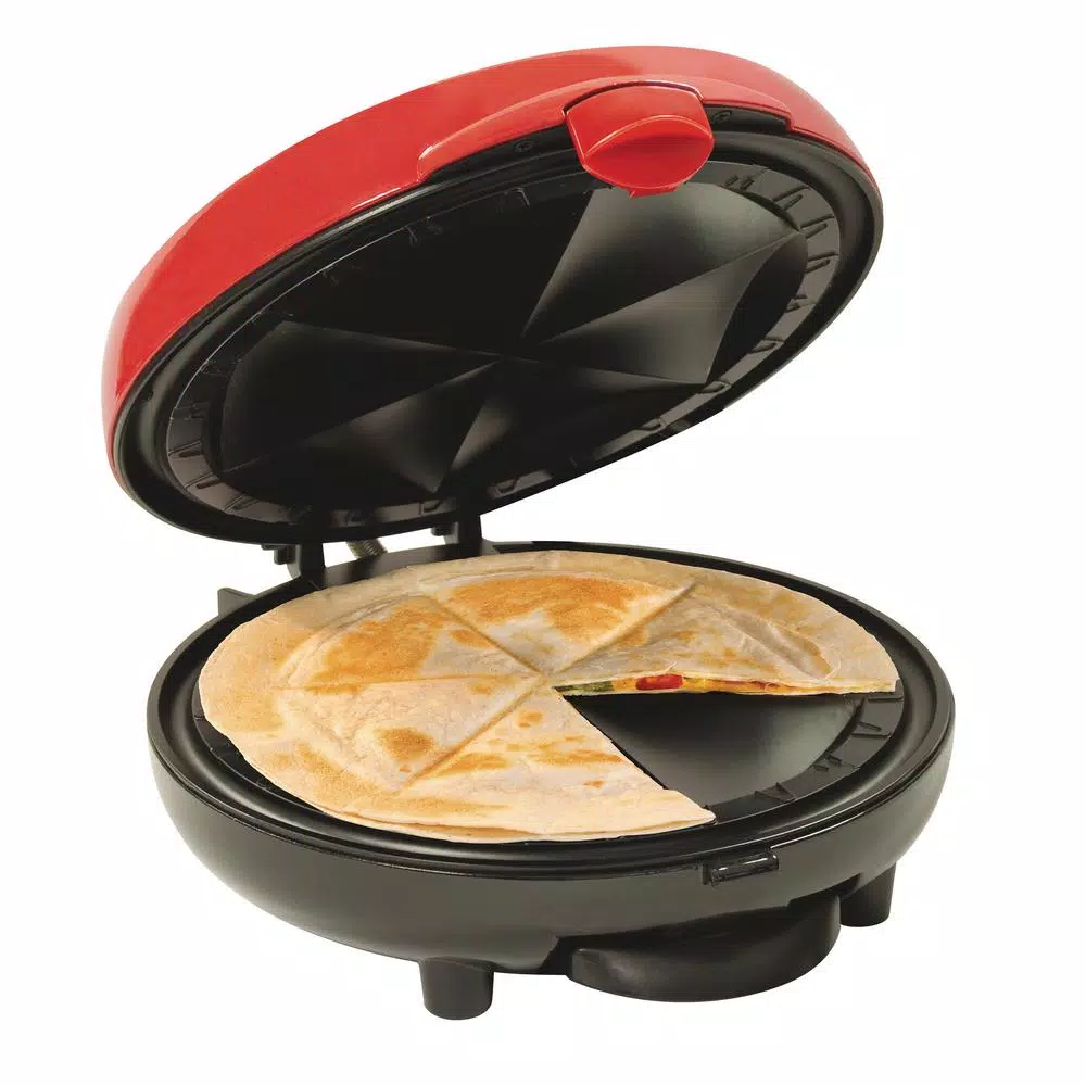 The Nostalgia EQM200 Fiesta Series 6-Wedge Electric Quesadilla Maker with Extra Stuffing Latch creates crispy and delicious quesadillas quickly. The extra stuffing latch allows for more filling and the plate design creates 6 wedges that seal in the flavor. With the non-stick surface and drip tray clean up is simple. Cooks quesadilla in 3 to 7 minutes depending on filling.