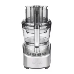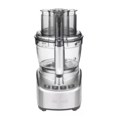 Cuisinart Elemental 13-Cup Food Processor features a 550-Watt peak power motor with 13-cup large work bowl and 4-cup smaller, inner nested work bowl. Its Seal Tight Advantage System seals bowl and locks blade with stainless steel body for added durability. It includes a dicing disc with 10 mm grid plus cleaning tool, stainless steel reversible shredding disc and stainless-steel adjustable slicing disc. Furthermore, it also features electronic touchpad controls that display High, Low, Off and Pulse with illuminating blue LED lights.