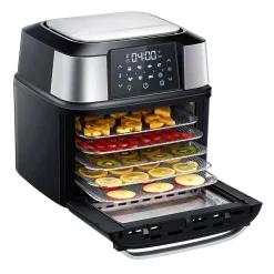 Use our 10-Tray Digital Food Dehydrator to create healthy, tasty treats your family will love. Dehydrating retains the flavor without preservatives, and saves fresh fruits and veggies from becoming spoiled. Dry bananas, apples, berries, tomatoes, mango and pineapple into chips, create fruit rollups, dry herbs and make yogurt at home. Love jerky, Combine your favorite jerky seasoning to make snack sticks and jerky strips with beef, venison, turkey or other ground meats. Based on what you are drying, select a setting on the digital temperature control panel, and set the digital timer for up to 12-hours for an automatic shut off. The rear mounted fan circulates for even drying with out having to rotate the racks. There is a removable drip tray for easy clean up. Includes ten nonstick trays.