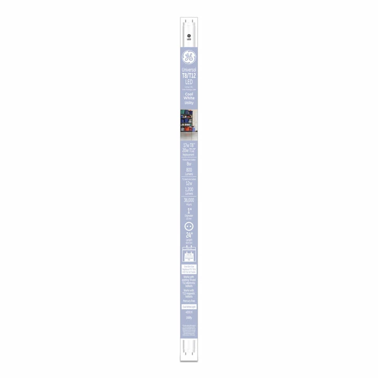 GE’s T8 LED tubes replace 24-inch T8—1-inch diameter—fluorescent bulbs using the existing fixture and electronic ballast. It’s slim size fits in the same fixtures as traditional 24-inch T8 fluorescent bulbs. Why make the switch to LED? GE’s LED tubes are rated to last 36,000 hours. They provide long 16-year life based on six hours use per day, so you’ll replace less often.