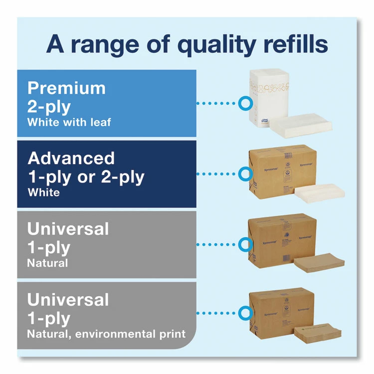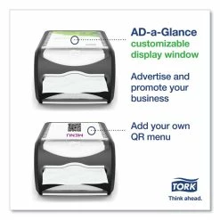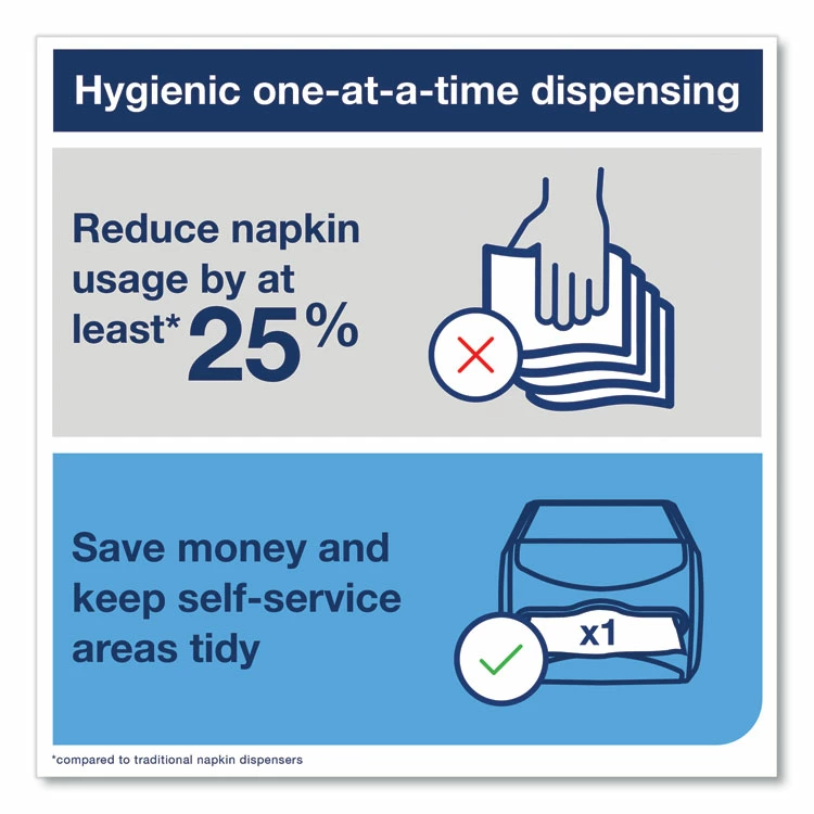 The Tork Xpressnap® Counter Napkin Dispenser is the ideal for limited service restaurants that offer napkins at a central location. This modern dispenser delivers napkins one-at-a-time, improving hygiene and reducing napkin consumption by at least 25%, when compared to traditional dispenser napkins systems. Versatile design, can be positioned vertically or horizontally for added flexibility where countertop space is limited; AD-A-Glance® customizable display window serves as an advertising tool to promote your products and engage with your guests; Made with durable and easy-to-clean materials that reduce maintenance and labor costs.