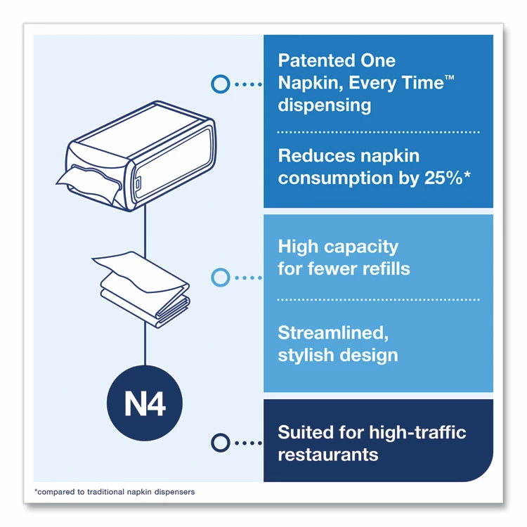 - Modern dispenser delivers napkins one-at-a-time, improving hygiene and reducing napkin consumption.