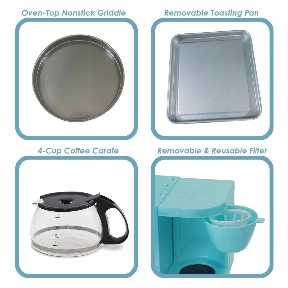 Start your morning right with the Americana by Elite 3-in-1 Mini Breakfast Shoppe. Enjoy freshly brewed coffee, toast and eggs all while saving you countertop space and energy. This compact unit features a Toaster Oven with a 15-minute timer control and indicator light, a 4-cup capacity coffeemaker with a swing-out filter compartment and a 6 in. Dia, frying griddle perfect for frying eggs and other breakfast foods. With its compact design, clean up is easy and storage is no-fuss. Toaster Oven: 15-minute timer. Indicator light. 500-Watt, Coffeemaker: 4-Cup capacity. Griddle: 6 in. Dia, frying griddle. Uses energy and heat from toaster oven. Perfect for frying eggs and other breakfast foods.